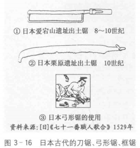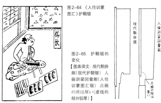 图2-64:江户时代中期[约1700-1780年康熙末期]的《人伦训蒙图汇》 图源:《锯 》(日)吉川金次著;徐筠舒译.2015。原文摘录:在中国好像也有很古老的青铜锯。在日本没有发现青铜锯,最初发现的金属器具就是铁锯。我认为,日本的锯是从中国经朝鲜传来的,这一点大概是可以肯定的。日本没有发现比4世纪前更古老的锯,但中国一直都有很古老的锯,所以我想日本也理所当然会受到其影响,因此也就原封不动地模仿了中国的锯。这个问题不能明确地回答,但是我想,虽然日本的锯受到了中国锯影响,但却不一定是完全相同地模仿。