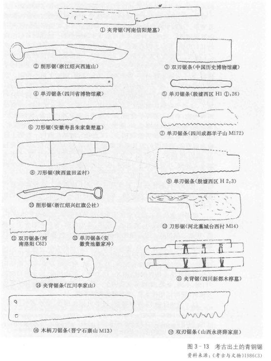 图源:《中国传统建筑木作工具》李浈著.--2版.--上海:同济大学出版社,2015.10. 原文摘录:商代的青铜锯种类简单,有刀形锯和单刃锯条两种,且形制一般较小,数量亦少,大多数是背厚刃薄,因而它的加工能力也受到一定的限制,适合小器物的加工。锯齿的形状基本上是等腰三角形,个别近直角(①,②),这类齿只适合断截。据考古研究,商代的锯主要用于骨角蚌器和小木器的加工,加工工艺主要是截断细径材料、作器物时开槽和小型材料的解割等加工①,如郑州、安阳等地都曾发现制骨作坊②中骨牙器的制作,大体要经过选材、锯割、加工成形、磨砺成器以及雕花、镶嵌等工序,所使用的工具主要是青铜锯、钻以及细砺石等③。