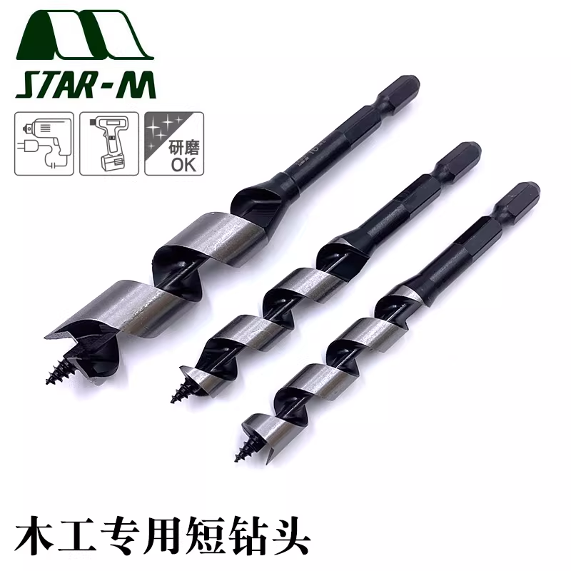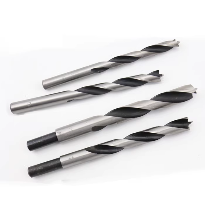 2)三尖钻(木工钻)、支罗钻---专门用于木质材料打眼,自带一个中心定位,可精确定位,日常使用需要注意保护好钻头尖部。