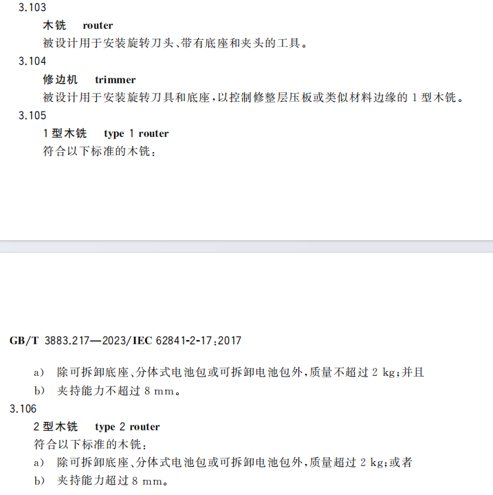 现行最权威、可直接公开引用的“官方解释”来自国家强制标准 GB/T 3883.217-2022《手持式、可移式电动工具和园林工具的安全 第 217 部分:手持式木铣的专用要求》。标准正文首次以“术语和定义”形式把二者纳入同一技术规范,并给出区分逻辑,要点如下: